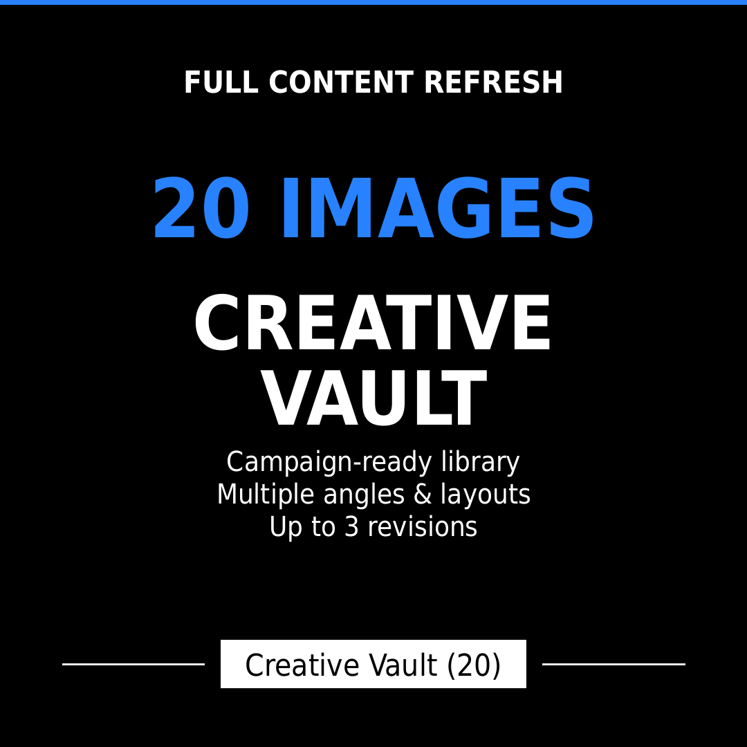 Built for businesses that need volume without sacrificing quality. This pack delivers a full library of visuals you can rotate across ads and social throughout the month with the Creative Vault Pack (20 Images).